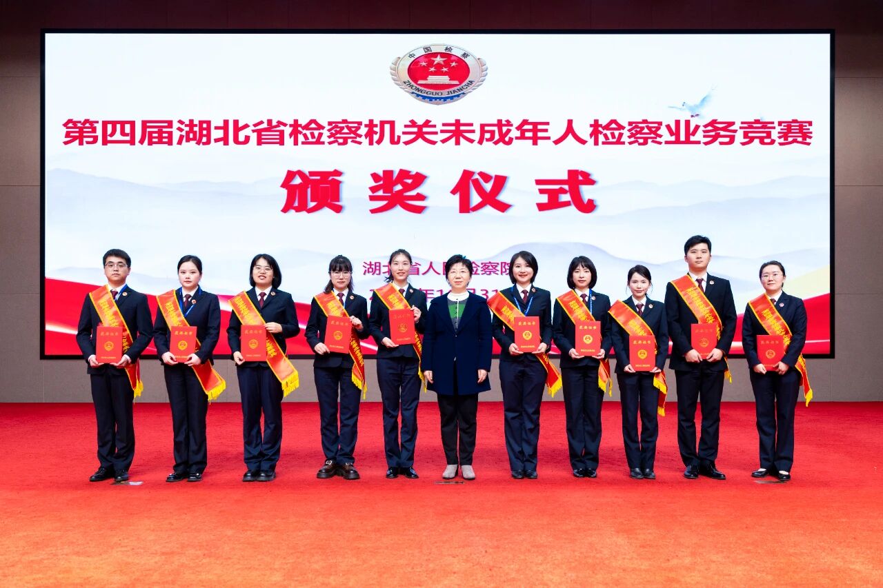圖為湖北省檢察院副檢察長吳婕為10名獲得“全省未成年人檢察業(yè)務標兵”稱號的參賽選手頒獎